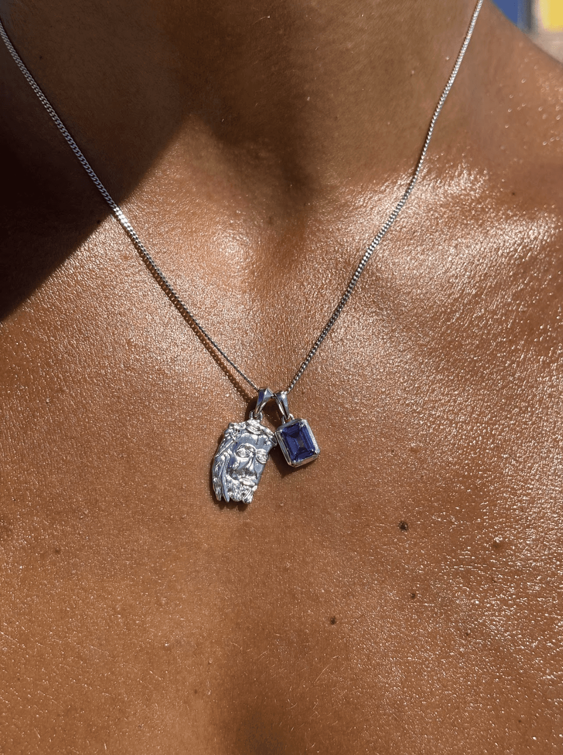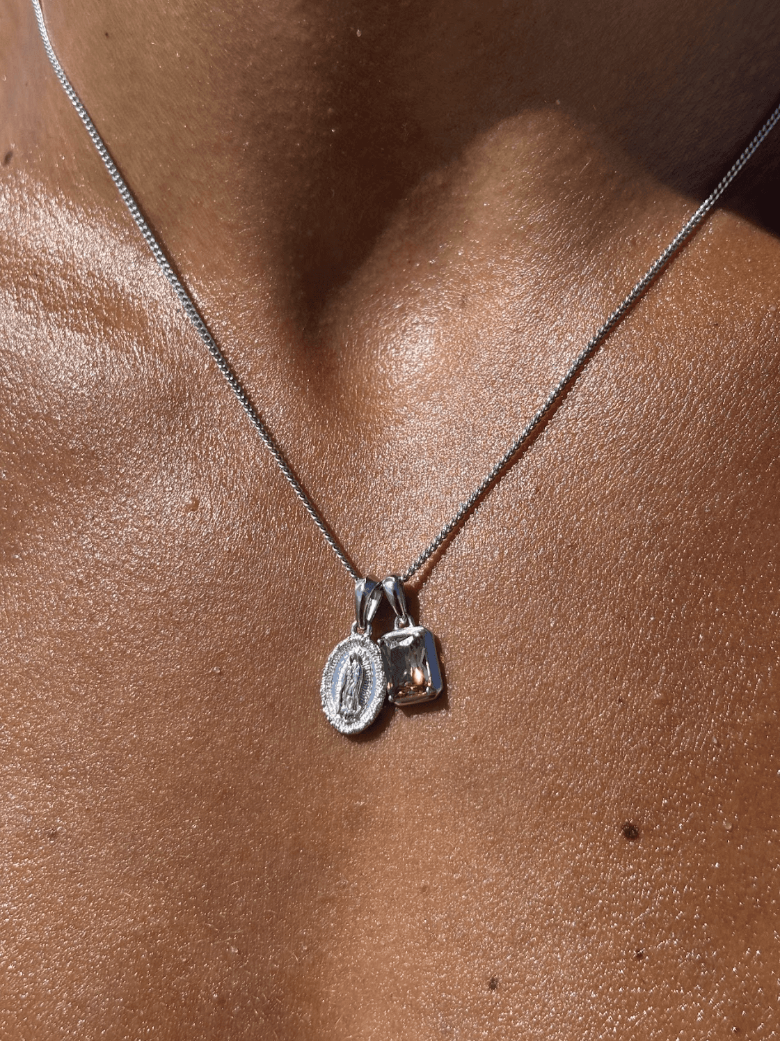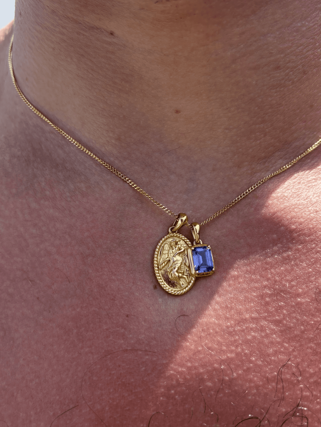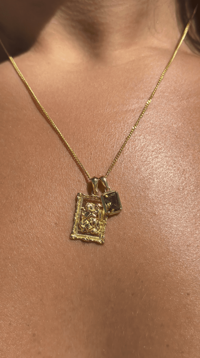 The Guardian pendant draws from the protective imagery of angelic figures and Byzantine borders. Its frame is heavy, detailed, and deliberate — a shield-like silhouette that speaks to strength and guidance.