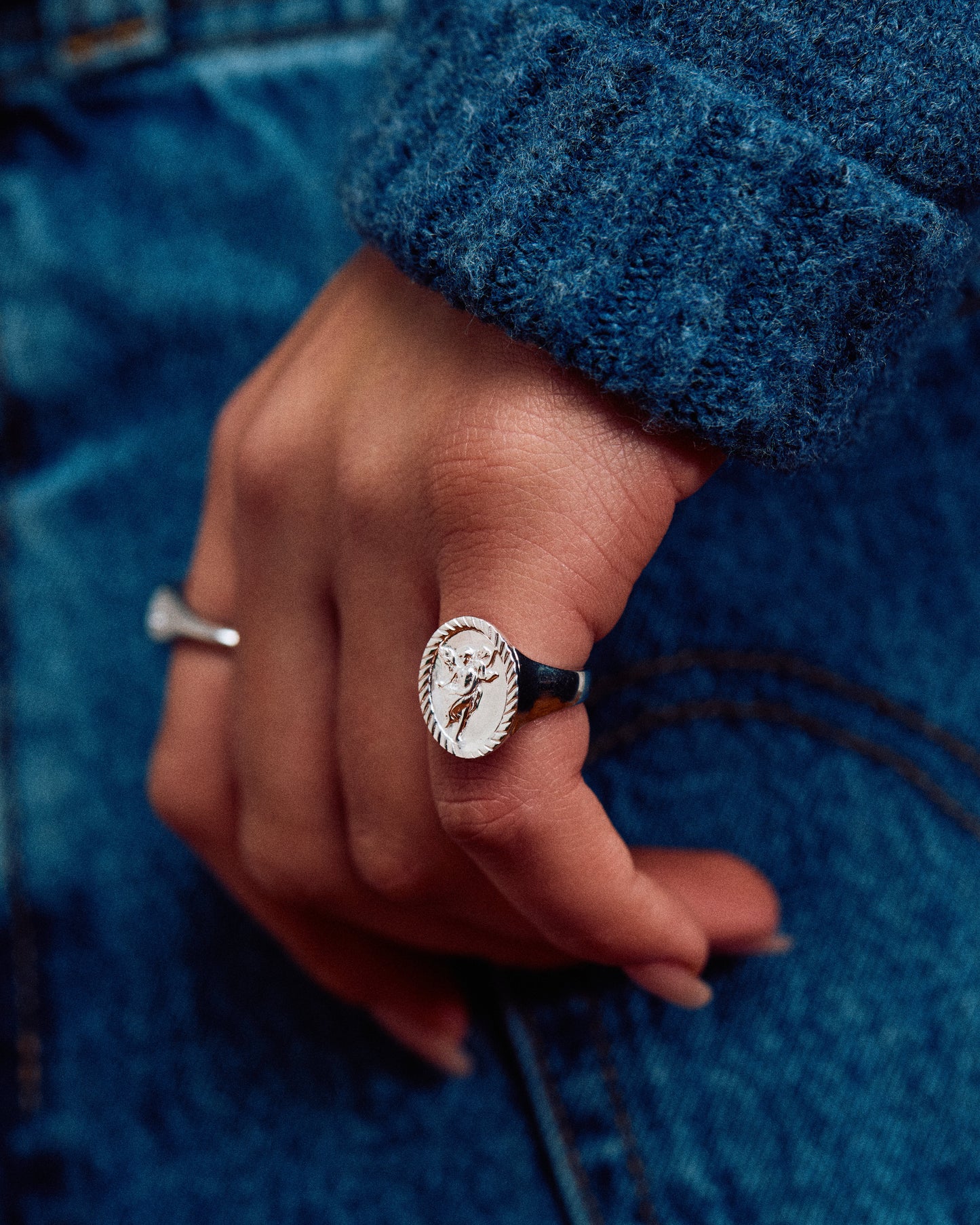 The Angelos Ring carries the weight of devotion and heritage. Inspired by the sacred iconography of Mediterranean jewellery, its design draws from the heavy silhouettes of vintage signet rings, framed with a structured border that feels timeless yet modern.