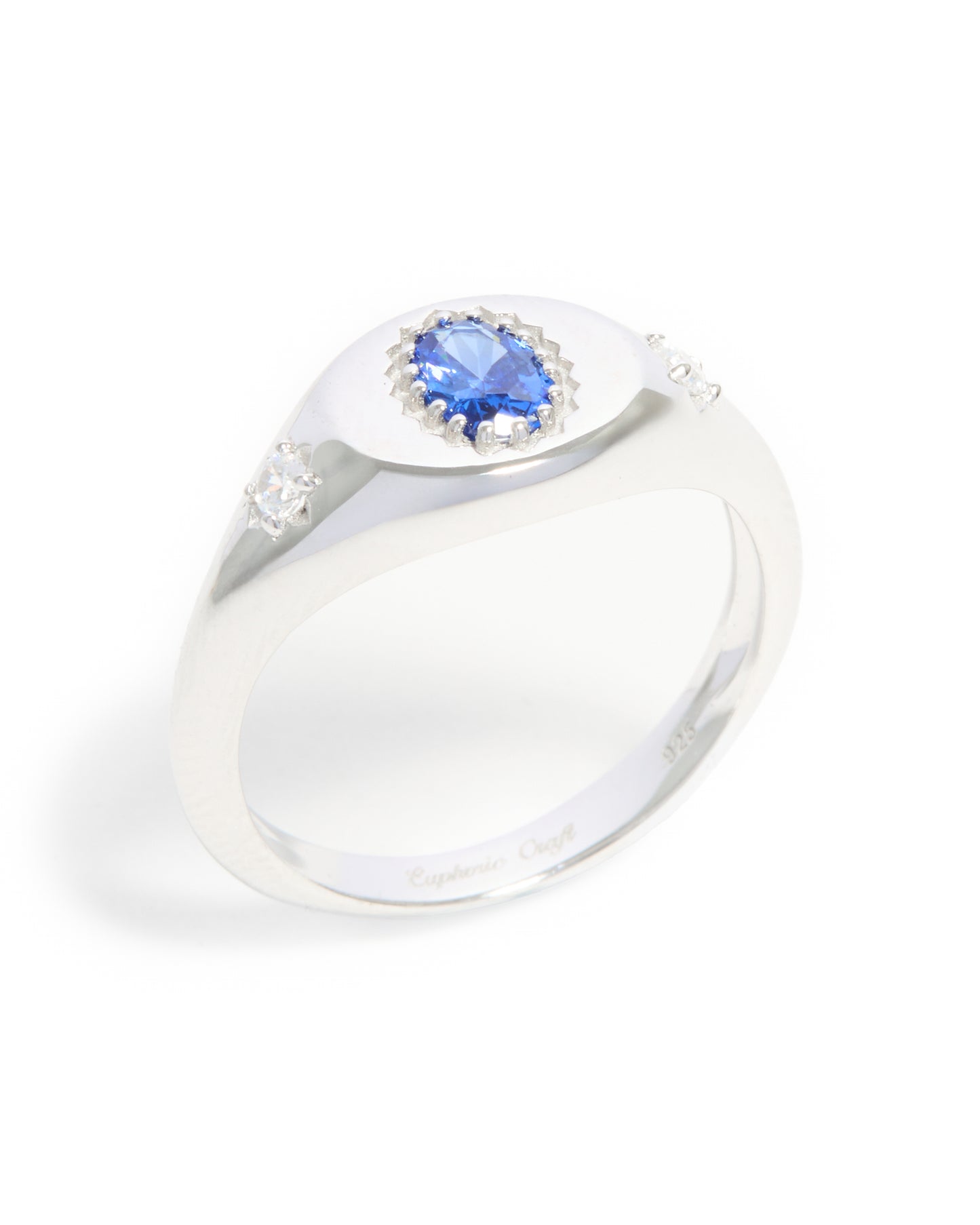 The Sapphire Sun Ring captures the spirit of southern Europe’s radiant coastlines. A deep blue sapphire sits at its center, glowing like the Atlantic under midday light, framed by a sunburst design that recalls old-world Mediterranean motifs and 2 Cz clear stones on the outside.